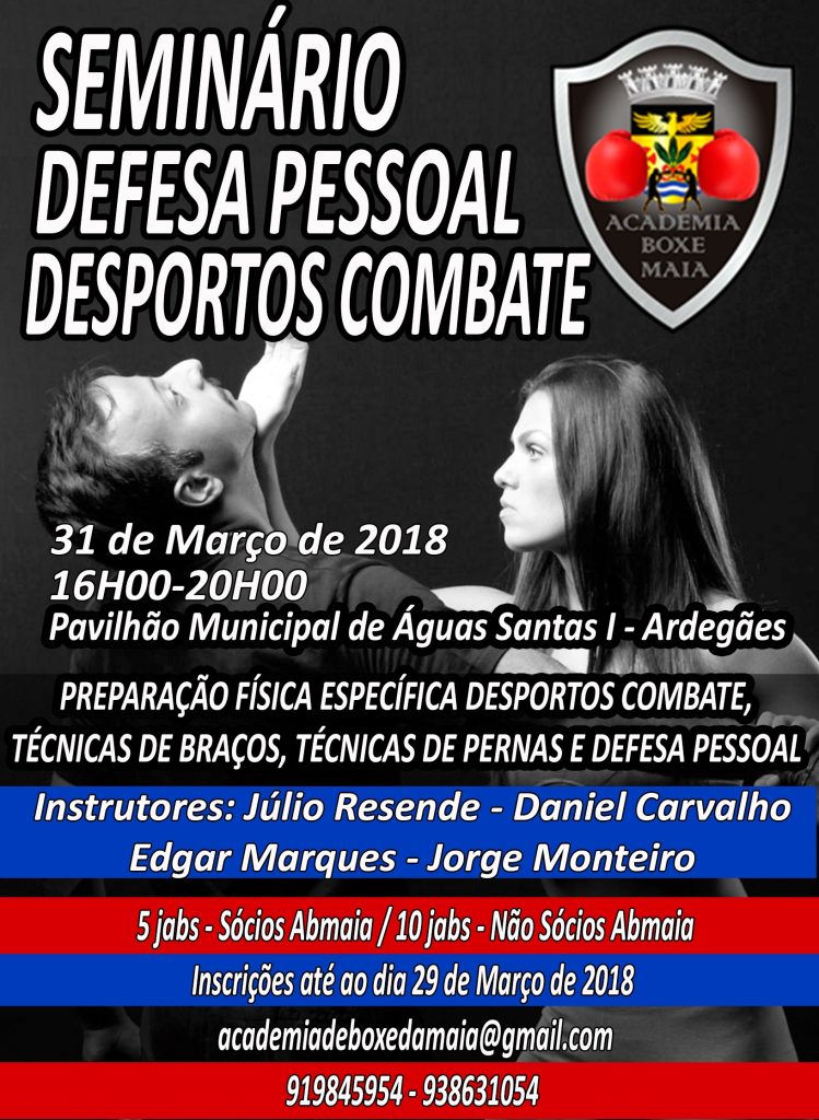 O seminário de Desporto de Combate e defesa pessoal é o segundo seminário desta Academia e terá a duração de quatro horas. Decorrerá nas instalações da Academia de Boxe da Maia no dia 31 de Março de 2018 e é mais uma atividade que pretende, tornar-se um marco importante nas actividades desta Academia. Á semelhança de outras atividades, como é o caso das Master Class, será mais um momento de convívio e promoção da modalidade, contando com a adesão de todos os nossos associados, ex-associados e de todos aqueles que de alguma forma nos acompanharam ou acompanham nesta caminhada, tal como amigos e familiares que queiram partilhar este momento connosco. Pretende-se também que seja um período de treino, companheirismo e confraternização entre todos aqueles que estão, já estiveram e que virão a estar connosco. Neste seminário serão abordados temas como a componente física especifica dos desportos de combates e artes marciais, assim como técnicas de braços, pernas e defesa pessoal, será certamente mais um momento único para mais tarde recordar.